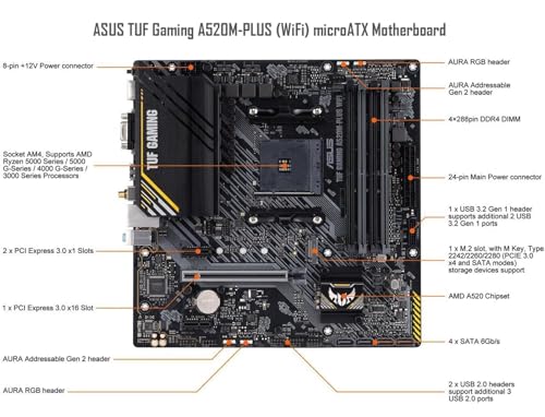 ASUS TUF Gaming A520M-PLUS WIFI Motherboard, mATX Form Factor, AMD AM4 socket, Support Dual Channel Memory DDR4 up to 128GB, 1 x M.2 Socket 3 with M Key, 4 x SATA 6Gb/s ports, USB 3.2 Gen 2 port(s)(1 x Type A), Windows 10 64-bit Support, Ready for AMD Ryzen 5000 Series/ 5000 G-Series/ 4000 G-Series/ 3000 Series/ 3000 G-Series Desktop