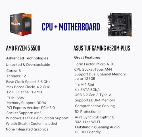 Micro Center AMD Ryzen 5 5500 Desktop Processor with ASUS TUF Gaming A520M-PLUS (WiFi) AM4 microATX Motherboard (M.2 Support, 802.11ac Wi-Fi, DisplayPort, HDMI)