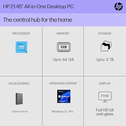 HP 22″ All-in-One Desktop PC • Full HD Display • 32GB RAM • 1TB Storage (512GB SSD and 512GB External) • Intel Ultra-efficient Processor • Type-C • Mouse and Keyboard Included • Windows 11 Pro