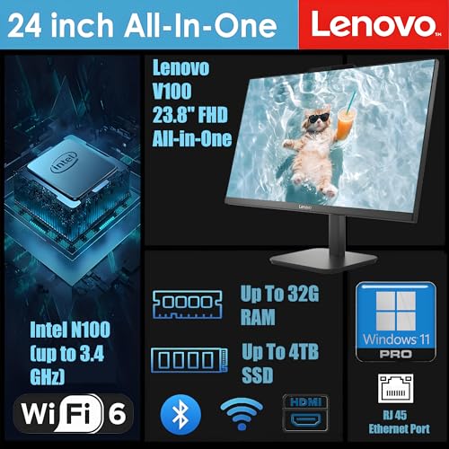 Lenovo 23.8″ FHD All-in-One Desktop Computer for Home & Business, Intel N100 (up to 3.4 GHz), 32GB RAM, 1TB SSD, Intel UHD Graphics, RJ45, Bluetooth, HDMI, Wi-Fi, Keyboard & Mouse, Windows 11 Pro