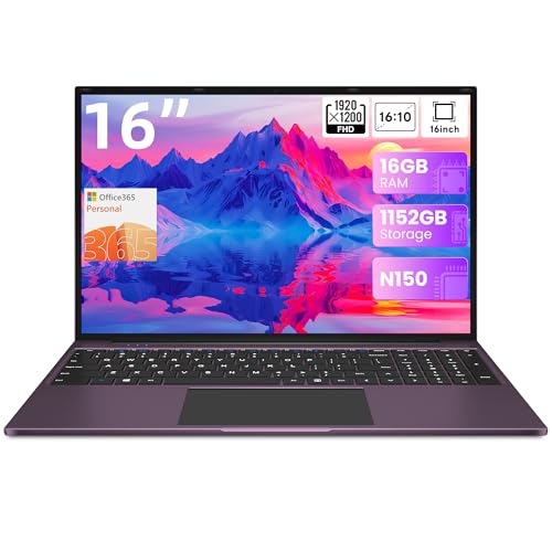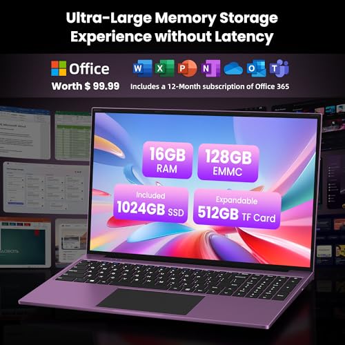 jumper 16 Inch Laptop,12th N150 Processor,1200P IPS Display,1-Year Office 365, 16GB DDR4, 1TB SSD 128GB ROM, Windows 11 Computer, tubro Boost 3.6GHz, Type-C, Purple, for Business and Students.