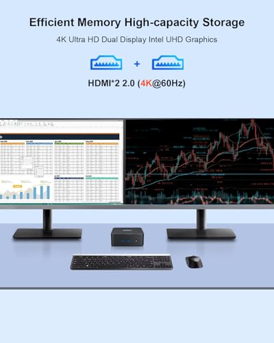 【Stunning 4K Dual Display Support】:Ninkear Micro PC features an Intel 750MHz GPU, supporting crisp 4K UHD (4096 x 2160) at 60Hz on dual screens (2x HDMI + VGA). Enjoy vivid, sharp images and vibrant colors for smooth web browsing, video playback, TV viewing, and home theater experiences. Dual HDMI ports easily connect 2-3 monitors, boosting your work, entertainment, and creativity efficiency.