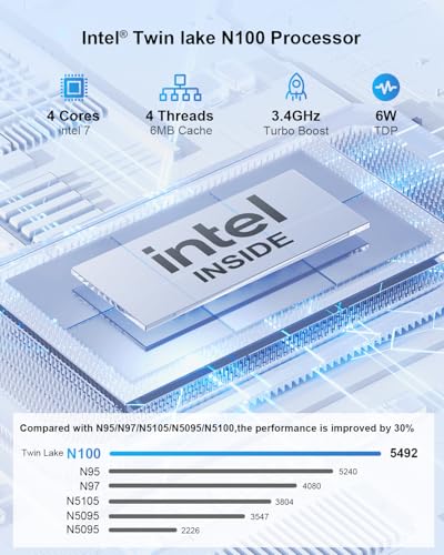 【Intel N100 CPU – Fast & Efficient】: 12th Gen Intel Twin Lake N100 (3.6GHz Turbo, 4 cores, 6MB Cache) — 2025 New Release. Compared to (N95/N97/N5105/N5100/N5095) series, CPU performance is up 35%, GPU (24 EUs) up 80% for smoother, faster operation. Intel UHD Graphics 750MHz easily supports web browsing, remote video, online learning, meetings, stock trading, graphic editing, email, office work, entertainment, and photo editing.