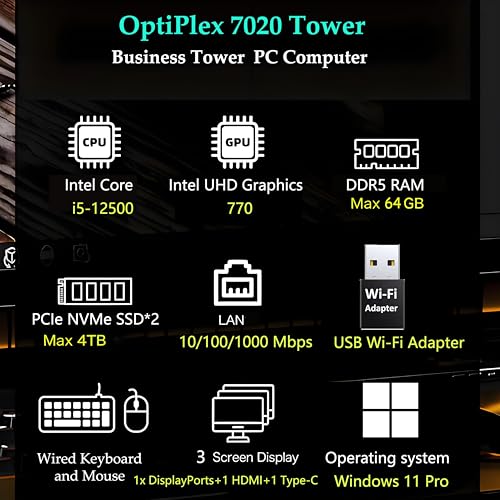 Dell OptiPlex 7020 Desktop Computer, 7000 Tower Dekstop PC, Intel Hexa-Core i5-12500 (Beat i7-11700), 32GB DDR5 RAM, 1TB PCIe SSD, DVDRW, USB WiFi Adapter, RJ-45, HDMI, DisplayPort, Windows 11 Pro