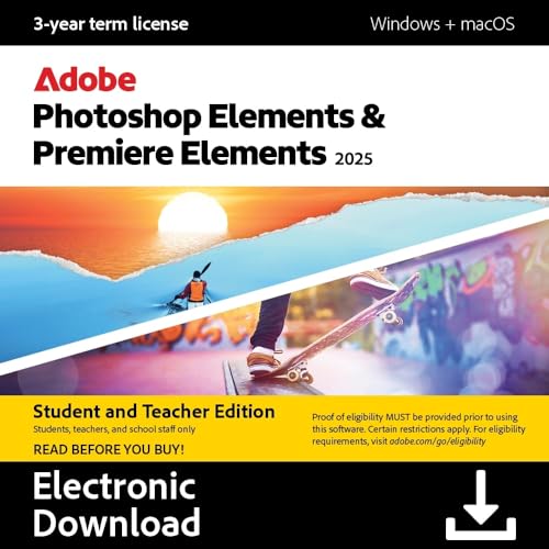 Adobe Photoshop Elements 2025 & Premiere Elements 2025 Student & Teacher Edition | PC/Mac Code | Software Download | Photo & Video Editing | 3-year term license | Activation Required